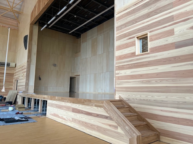 体育館のステージ框や階段には、肌触りが滑らかで強度に優れたタモ集成材が使用されています。