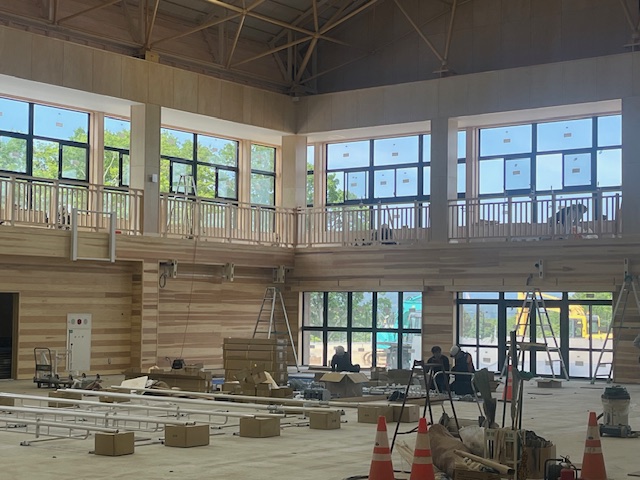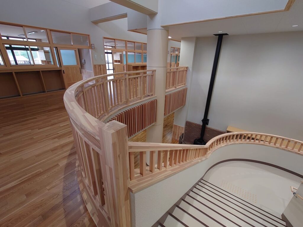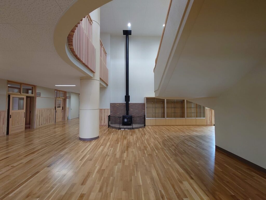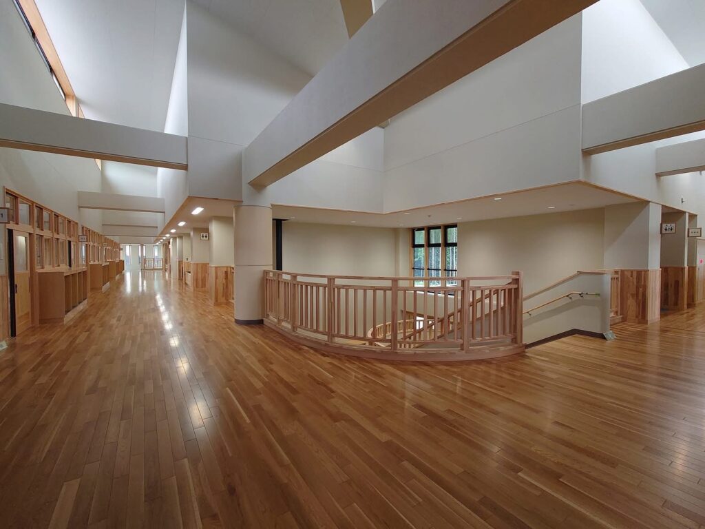 新校舎は鉄筋コンクリート造でありながら、内装には大胆に木材が使用されており、大変明るい雰囲気の校舎内となっています。